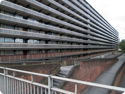I have been walking through this estate for ten years, over the aerial walkways, to the tube from my house. It is the scenic route when I have time. I have enjoyed the multitude of contradictions it somehow brings to mind, between desires for utopia in its conception to the entropy that followed. When I built my own house nearby my building inspector was in charge of these buildings. He told me how the prefab units that where inset into the frames were bolted on with one bolt a side rather than the required four and that he wouldn’t live in the Heygate for safety reasons, quite apart from anything else. The flats are actually over size inside and very nice but the image of the place is ubiquitous in the media, cop shows adverts, etc whenever they need an urban dystopian location. The extent to which the design, the upkeep, or the social mix is responsible for this is an interesting discussion, but the result can not be argued with. A friend who lived there made sure she was back in her flat by nightfall and did not venture out after that.